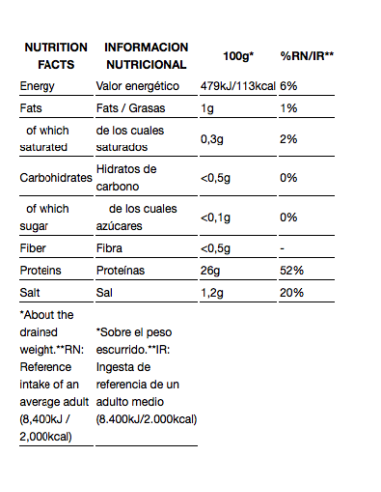 | Información nutricional | CHICKEN BREAST (PECHUGA DE POLLO AL NATURAL) 155 GR. |