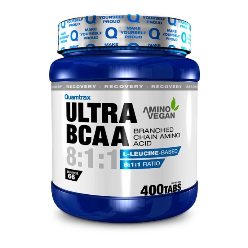 Aminoácidos obtenidos por fermentación, no contienen ingredientes de origen animal: Utra BCAA 8:1:1 se presenta en tabletas de origen 100% vegano, bajo la patente AminoVegan. Ultra BCAA 8:1:1 de Quamtrax, más energía, menos fatiga y máxima recuperación