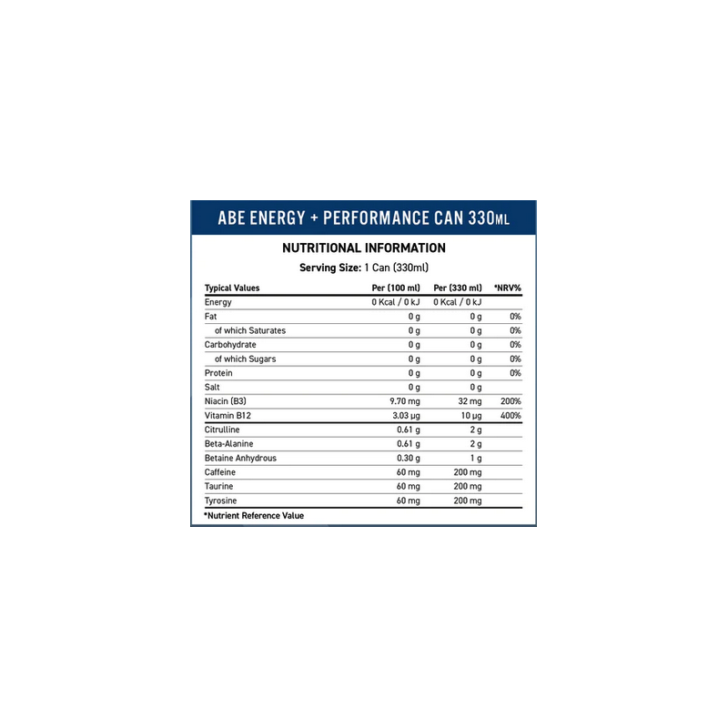 Bebida carbonatada ABE con cero azúcar, 200 mg de cafeína, citrulina, beta-alanina, taurina y vitaminas B añadidas.