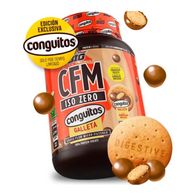 Recupera uno de los sabores más auténticos de tu infancia, pero ahora con un contenido muy bajo en grasas e hidratos de carbono y con un aporte extraordinario de proteínas. CFM ISO ZERO CONGUITOS® GALLETA está disponible en 2 deliciosos sabores con corazón de galleta y trozos de Chocolate con leche o trozos de Chocolate blanco