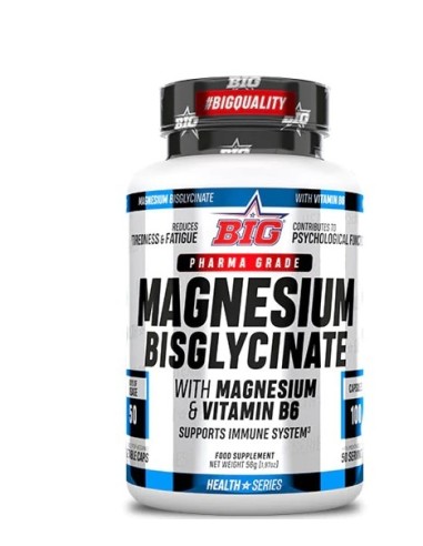 Magnesium Bisglycinate 100CAPS (Big). El Bisglicinato de Magnesio es la forma de mayor biodisponibilidad de magnesio disponible en el mercado. Se elabora a partir de magnesio de alta calidad, que después se une a 2 moléculas de glicina. Esto produce un compuesto de magnesio que, a diferencia del óxido de magnesio, es absorbido muy fácilmente por el cuerpo.