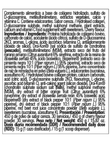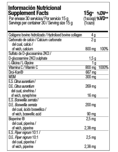 1,5 gr de Glucosamina y 667mg de Droi Kon® por toma, para reforzar y reparar nuestros cartílagos debilitados por el entreno intenso y/o por la edad, evita llegar al desgaste o roce de tus huesos a toda costa o lo lamentaras de por vida!
